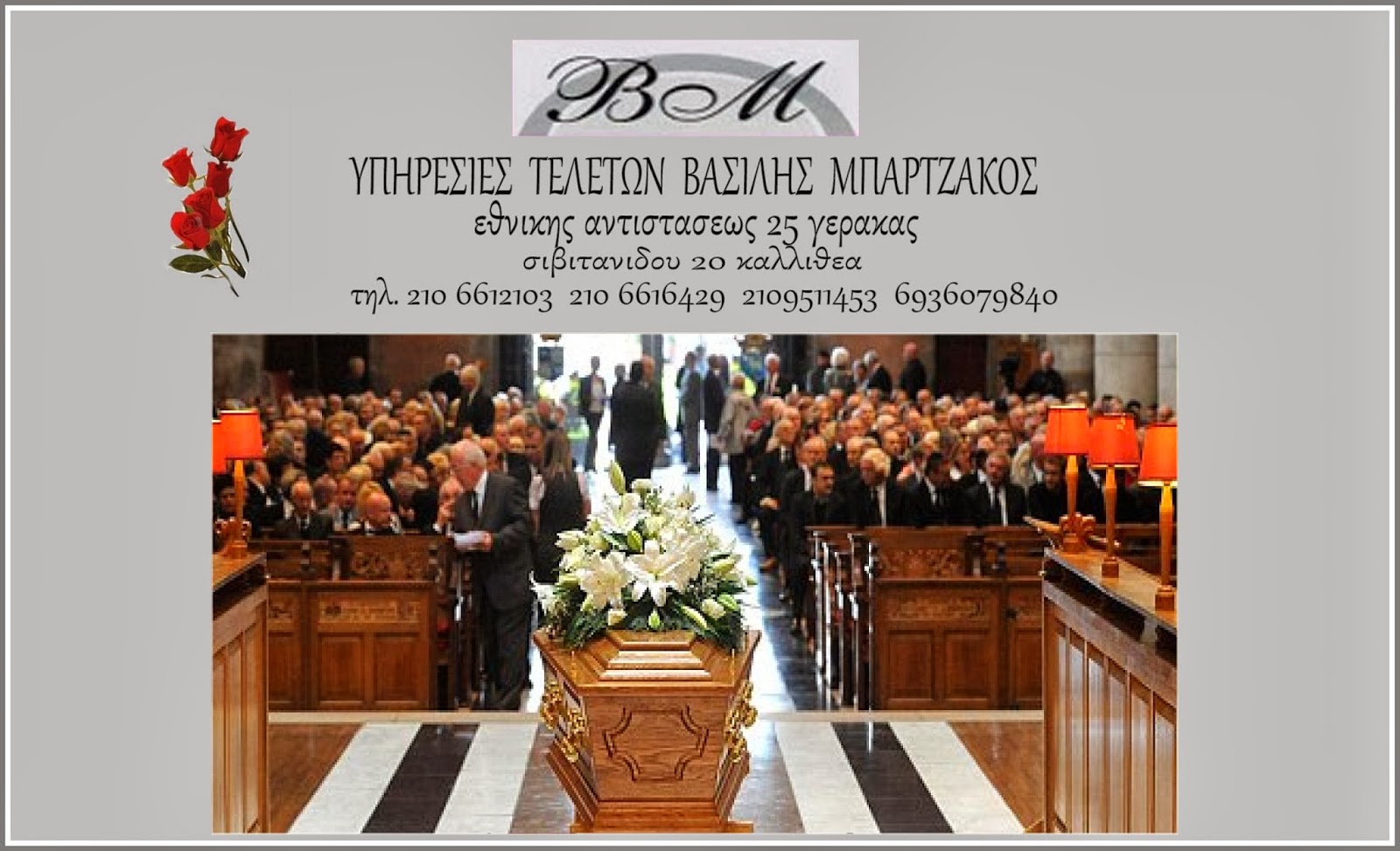 Η Εταιρεια τελετων Βασιλης Μπαρτζακος εινναι διπλα σας 24 ωρες την ημερα ολες τις ημερες της εβδομαδος 58 ολοκληρα χρονια στην Αθηνα παρεχοντας υπηρεσιες υψηλου επιπεδου με τις καλυτερες παντα τιμες της αγορας. Εμεις θα σας δωσουμε τις πληροφοριες που χρειαζεστε θα σας καθοδηγησουμε βημα βημα για το αγαπημενο σας προσωπο και μεσα απο τα διαφορα οικονομικα πακετα που προσφερουμε θα κανετε την τελετη με ποιοτητα και με πολυ προσιτους ορους. Ειμαστε στον Γερακα στην οδο Εθνικης Αντιστασεως 25 στην Καλλιθεα Σιβιτανιδου 20 στην Αθηνα Δεφνερ 1 στα τηλεφωνα 2106612103 2106616429 2109511453 6936079840 6931593762 προθυμοι να ακουσουμε το προβλημα σας και να το λυσουμε απο κοινου.